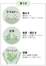 水耕栽培にはレタス、ベビーリーフ、ルッコラ、バジル、ミント、小松菜などが適しています。品種によって異なりますが約3~4週間で収穫できるとのこと。セットには種は付属しません。