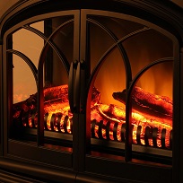 炎のようなパネルと薪部分が点灯し、揺らぎのある炎がリアルな暖炉のようにみえるファンヒーター。側面からも炎パネルが見え、立体感を出した。炎パネルだけ点灯することも可能です。