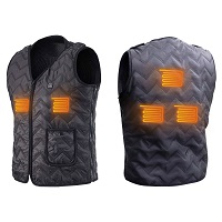 モバイルバッテリーを接続して使用する、ヒーター内蔵ベスト。前面にモバイルバッテリーを収納するポケットが付いていて、10,000mAhのモバイルバッテリーを使用した場合、約7~8時間使用できます。ヒーターは電源を入れてから約10秒で暖かくなる。温度調節は低温(約45~50℃)/中温(約50~55℃)/高温(約55~60℃)の3段階。