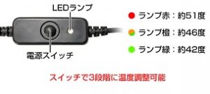 ヒーター部分は簡単に取り外す事ができるので、ルームシューズを洗って清潔に使うことができます。高:約51度 / 中:約46度 / 低:約42度の三段階で温度調整ができます。スイッチ中央に温度調整ボタンが付いていて、押すたびに温度が高中低と切り替わっていきます。