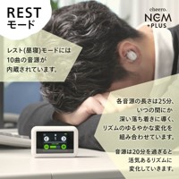 音源は睡眠モード向けの20種と仮眠モード向けの10種を用意、睡眠モードでは60分再生したあと停止、仮眠モードでは20分経過後にリズムが変化して目覚めやすくします。付属のワイヤレスイヤフォン以外のBluetoothイヤフォンを接続することも可能で、有線接続用の3.5mmステレオジャックも備えています。