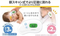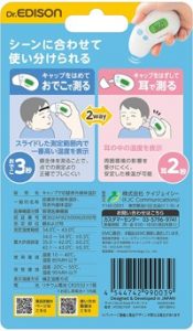 額・耳の2通りの検温ができる赤外線体温計。額を測る際には、おでこをスライドさせた範囲内で数か所測定し、高度なアルゴリズムで体温を表示。寝ている幼児などを起こすことなく、検温ができるとのこと。またキャップを取り外すことで、耳での測定にも対応します。