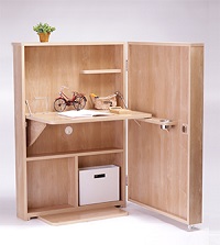 扉面にキャスターを備え、簡単に開閉できます。扉面には小物を収納できる棚、カバンなどを下げられるハンギングバー、カップホルダーを搭載。前方の壁面にデスクとなる天板、足元収納を用意。天板と壁面にケーブルスリットと配線孔を配置し、ケーブルを通すことでデスク上をすっきりと見せられます。