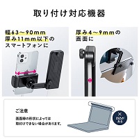 ノートPCなどのディスプレイの角に取りつけられる製品。背面に指で回せるねじがついていて、テープや工具を使わず、挟み込むように装着できる設計となっています。ホルダー部分にはボールジョイントを採用し、スマートフォンの角度や向きを自在に調整が可能です。