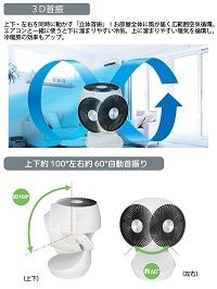 上下・左右立体首振り運転機能を備える。上向き約90度まで首を振るため、部屋の隅々まで空気を循環できます。また「部屋干しモード」では、強風運転で左右の首振りをしながら、上下を一定の角度で首振り運転します。