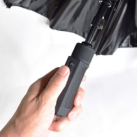 一般的なワンタッチ式折りたたみ傘だと開く時の勢いが強すぎて危ない&水しぶきが飛んでしまいます。傘を畳むのが大変で濡れて手間と時間がかかってしまいます。「スマート傘」なら電動でゆっくり開くから水も飛び散らない。キャリーを持っている時も片手で傘を閉めながら乗る事も可能です。