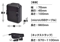 本体の裏側フックをベルトに、表側フックをシャツの裾に引っかけて、服の中に風を送るファン。ネックストラップが付属し、首にかけて使うこともできます。風量調節は3段階。USB充電式で、約3時間の充電で約1~5時間動作します。