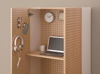 自宅に簡単に設置できる一人用のブースデスク。業務に集中できるほか、扉と内面の有孔ボードにフックなどを設置して小物を掛けられるようにアレンジできます。