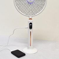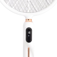 高圧電流で虫を退治するラケット形状の蚊取り器。虫を退治するたびカウントし、本体ディスプレイに表示します。手に持って直接退治するほか、卓上の誘蛾灯としても使用可能。USB充電式。