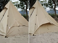 DODの非自立式テント史上、最も設営工程が少ないピラミッド型テント。インナーテントはメッシュ/フルクローズの切り替えが可能でフライシートにはスカートが付いているため、オールシーズンのキャンプで使うことが可能。