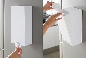冷蔵庫の側面にマグネットで取り付けられる「ツーウェイレジ袋ストッカー タワー」。外から中が見えないデザインのため、レジ袋を隠して収納可能。レジ袋を取り出す際は、本体下部からサッと引き出せます。