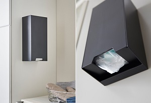 付属の木ネジで壁や木製のキャビネットなどに取り付け可能。キッチンカウンターなどに置いて使うこともでき、その場合は上部のフラップを開けてレジ袋を取り出します。本体サイズは約140×102×300mm(幅×奥行き×高さ)。重量は約860g。耐荷重は約2kg。本体カラーはホワイト、ブラック。