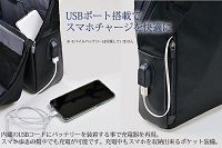 本体ファスナーを全開にして前に倒すと収納棚に変身。 オフィスのデスクやシェルフのような感覚で、開けたその場で仕事が始められます。USBポート搭載で歩きながらでもスマホチャージが可能。内蔵コードにバッテリーを装着する事で充電器になります。