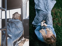 超コンパクトに持ち歩ける毛布。外側は通気性の高いナイロン、断熱材には100%PETリサイクル素材を使用。
