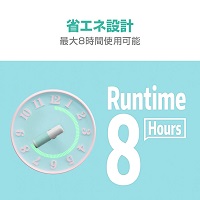 「KiCA MINI」は省電力のメカニズムにより電力効率の最適化を行い、1回の充電で最大8時間の動作が可能です。最も強いモード3の使用時でも約2時間30分の動作が可能で、電池残量を気にすることなく、快適に使うことができます。