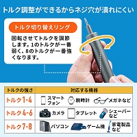 ネジを締める強さを1~8まで選べるトルク調整機能付きの精密ドライバー。ネジや状況に合わせて調整できます。本体サイズは約20×176mm(直径×高さ)。重さは約112g。