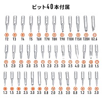付属のビットは40本。いずれもクロムバナジウム合金鋼よりもさらに硬度を高めた「S2鋼」を採用。スマートフォンに使用されているヘックスローブ(六角星型)やペンタローブ(五角星型)のビットも付属します。USB充電式のバッテリーを内蔵。1.5時間の充電で、連続使用時間は3時間。
