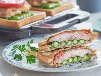 2個のホットサンドを同時に作れる電気ホットサンドメーカー。仕切りのないワイドプレートを採用、よりたくさんの食材をはさんで焼ける点を特徴としています。具材が多くても食パンの端がしっかりプレスされるため、断面が「映える」とのこと。
