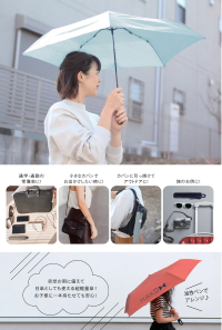 軽量に加え、小さいカバンにもすっぽり入る優れもの。丈夫なカーボンファイバー骨で強風時に反り返っても折れにくい5本骨を採用しています。また、UVカット95%以上のため日傘としても便利。