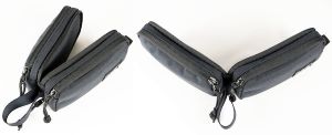 2WAYタイプのガジェットポーチ。中央のファスナーを開けると、ポーチが半分に展開して厚さ3cmになる作り。変形することでかばんなど荷物の隙間に詰め込むことができ、機内持ち込みや受託サイズのスーツケースへの収納も考慮しています。
