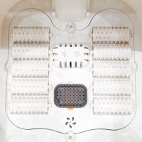 本体に水を入れて好みの温度に設定するとヒーターで自動加熱するフットバス。7色の色が自動で変化するLEDの点灯が可能。足首にむけてシャワーを噴射する「かけ湯機能」、底部には足で回せる足ツボローラーを備えています。