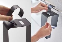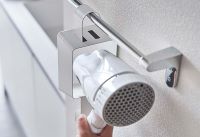 収納場所に困るドライヤーを収納できるホルダー。タオルバーに引っ掛けてドライヤーを収納できます。フックは着脱式のため、左右どちらからでもドライヤーを差し込めます。