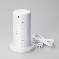 AC差込口にと5個のUSBポートを備えたタワー形状の電源タップ。USBポートは、USB Type-Cポート×2口、USB Type-Aポート×3口で、合計最大出力は45W(5V/9A)。AC差込口は階層ごとに45度ずらした配置になっているため、大きなACアダプターも他のAC差込口に干渉しにくい設計となっています。またコンセントプラグは180度スイング可能なため、狭い場所でも設置しやすくなっています。