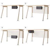 TAP-UPは、しっかりと挟み込むクランプ式なので、デスクの様々な位置に取り付けられます。1.天板、2.すきま、3.フレーム、4.デスク下部など、好みの形でデスクに取り付けられます。