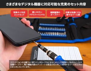 スマートフォンやパソコン、ゲーム機など様々なデジタルガジェット類の分解・修理作業に役立つツールセットです。プラス・マイナスなどのごく一般的なものからセキュリティトルクスやペンダローブなど分解作業には欠かせない特殊ネジに対応する豊富なビット類、各種オープナーやマグネットシートなど作業を効率化してくれる様々なアイテムがワンパッケージとなっています。
