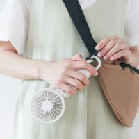 ネックストラップが付属し、本体をつなげて首から下げるとハンズフリーで使えます。また本体のファングリルを立てることで自立するため、デスクファンとしても使用可能。ファングリルの角度は約110度の範囲で調節できます。