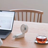 独自の2重反転ファンを採用し、コンパクトサイズながら大風量を実現。本体背面のファンで空気を集め、前面のファンから筒状の風を届けます。風量は「弱/中/強/ターボ」の4段階。USB充電式で、連続運転時間は順に10/5/2/0.5時間。充電時間は約6時間。
