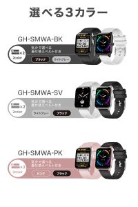 GH-SMWAは、心拍数や血中酸素濃度、睡眠モニタリング、エクササイズモードなどに対応したスマートウォッチ。専用アプリからAmazon Alexaと連携でき、音声でスマート家電などを操作可能。スマートフォンの通知を受け取れる機能や、リモートシャッター機能なども備えています。