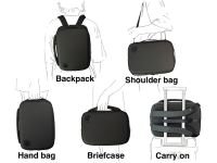 製品名「シューベルト」の通り、本体にシューッとベルトが吸い込まれるというアイデア製品。リュック、ショルダー、ハンドバッグ、ブリーフケース、キャリーケースのハンドルにセットの5形態で利用できるもので、床置きの際も自立するバランス設計とのこと。