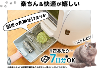 ねこの出入りを検知して素早く清掃してくれるこの全自動ねこトイレ。固まったねこ砂やウンチだけを分け、ダストボックスへ処理してくれます。しかも約7日分の排泄物を処理することができます。