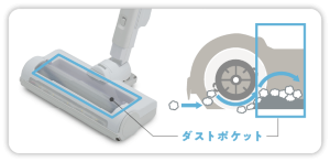 スティッククリーナーのヘッド部分に、モーターとダストポケットを搭載。新たに搭載された「ちりとり」モードでは、ヘッド搭載のモーターを駆動することでゴミを掻き出し、一時的にダストポケット「ちりとりヘッド」へゴミを溜めていきます。ちりとりモード使用時は、約45dBと高い静音性を実現。実感音は、同機のターボモードと比較して約1/4に抑えられるとのこと。