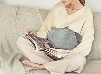 シートに印刷した銀ナノインクが発熱する腹巻き。シート部分は厚さ1.5mmで、最大50℃まで発熱します。温度調節は3段階。バッテリーが付属し、最長で約5時間コードレスで使用できます。シートは両面が発熱するため、腹部と手を同時に温められます。