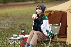 森のなかでのキャンプシーンを描いた完全オリジナルのブランケット。サイズは約60×100cm(縦×横)と大きめで、冬のキャンプやクルマの常備品に最適です。