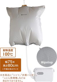 ホースをファスナーテープで固定する仕様のため、様々なふとん乾燥機に対応可能。本体生地には張りのある、引き裂きなどに強いリップストップ生地を採用。すっきりとした見た目と強度、収納時の畳みやすさを実現しています。