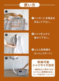 手持ちのふとん乾燥機をセットして使う衣類乾燥用の「エアートルソー」。本体をハンガーに掛けて、その上から乾かしたいワイシャツなどの衣類を着せ、ふとん乾燥機のパイプをつなげて、乾燥をスタートさせます。