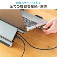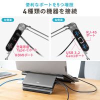 USB Type-CケーブルでPCに接続し、USB Type-C(最大100WのUSB PD対応)×1、USB Type-A×2、有線LAN(1000BASE-T対応)×1、HDMI×1(4K/60Hz対応)の4つのポートを拡張できます。各USBポート/コネクタはUSB 3.2 Gen 1対応。DisplayPort Alternate Modeに対応し、ソフトウェアのインストールなしでマルチディスプレイ環境(ミラーリングまたは拡張モード)を実現できます。