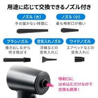 付属ノズルは、手の届かない隙間に使える「ノズル(大)」、噴射口が細い「ノズル(小)」、エアコンフィルターの汚れなどを掻き出しながら吹き飛ばす「ブラシノズル」、浮き輪などの空気入れが可能な「空気入れノズル」、エアベッドなどの空気入れ用の「ワイドノズル」。
