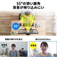 フルHDでの撮影が可能な200万画素のウェブカメラ。カメラ前面に、手動で明るさを設定できる「調整ボタン」をカメラに内蔵、逆光などで顔が暗く映っていても調整で明るくすることができます。また、水平画角55度のレンズを搭載することで、背景が映り込みにくく、個人で使用するのに丁度いい画角に収まるようになっています。