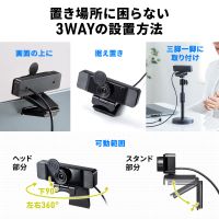 ノートパソコンやデスクトップPCのディスプレーに取付可能なスタンドにはカメラ用三脚穴を内蔵し、市販のカメラ用三脚に取り付けることもできます。レンズには物理的に隠して映像をシャットアウトできるプライバシーシャッターが付いています。