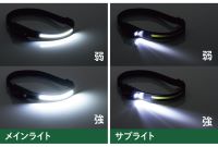 メインライト、サブライトともに明るさを強/弱で切り替え可能。電源ボタンを押すたびに、メインライト(強)→メインライト(弱)→サブライト(強)→サブライト(弱)と切り替わります。電源ボタンを長押しすると、2つのライトがフラッシュ点滅します。
