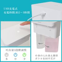 キッチン以外にも洗面所や風呂場にも設置することができます。シャンプーやボディソープなどを入れても便利に使えます。壁に貼り付けることで、宙に浮かせておくこともできます。充電式電源を採用。約2~3時間で充電完了、フル充電で約3000回使用することができます。出てくる洗剤やソープの量は3段階で設定を変えることができます。