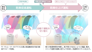 除湿機本体が、室温上昇と湿度低下など部屋の状況変化から、洗濯物の乾き具合を判断。赤外線通信によりサーキュレーターと連動運転し、自動でサーキュレーターの風量や風向、スイング速度を調整するほか、「乾燥仕上げ運転」に切り替えて、乾き残りがないようにします。
