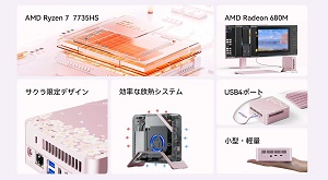 MINISFORUMは、サクラの花柄をあしらったミニPC「UM773 SE」を発売しました。価格はベアボーンで62,120円(通常価格は76,900円)、Windows 11 Pro搭載モデルはメモリ16GB+ストレージ512GB SSD構成で84,520円(10万4,900円)から。既に在庫があり、1週間以内に出荷可能とのこと。