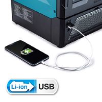 運搬しやすい折りたためる大型ハンドル付きで、別売りのショルダーベルト「A-60589」(税別1,000円)も取り付け可能です。建築・建設現場や車内などどこへでも持ち運べて、その場で弁当や飲み物を温めて美味しく食べられます。さらにUSB電源端子付きで、USB機器も充電でき、災害時にも役立ちます。USB端子はType-Aで、最大出力は2.4A。