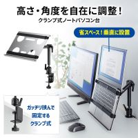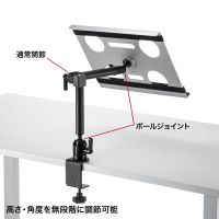 CR-LANPC3は、固定方式にクランプを採用し、厚さ85mm以下の天板に固定できるノートPCスタンド。2つの関節にボールジョイントを採用し、高さおよび角度を無段階に調節できるため、立ち作業での使用にも好適。
