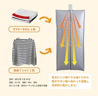 カバー内の限定した空間で効率良く乾燥するため、室内干しでは乾かすのに10時間ほどかかる衣類も1時間ほどで乾燥できる。数枚だけ乾かしたいときや、子供の体操服や制服など、急に洗濯が必要になったときに役立ちます。